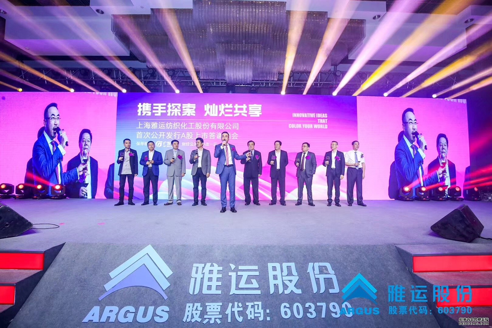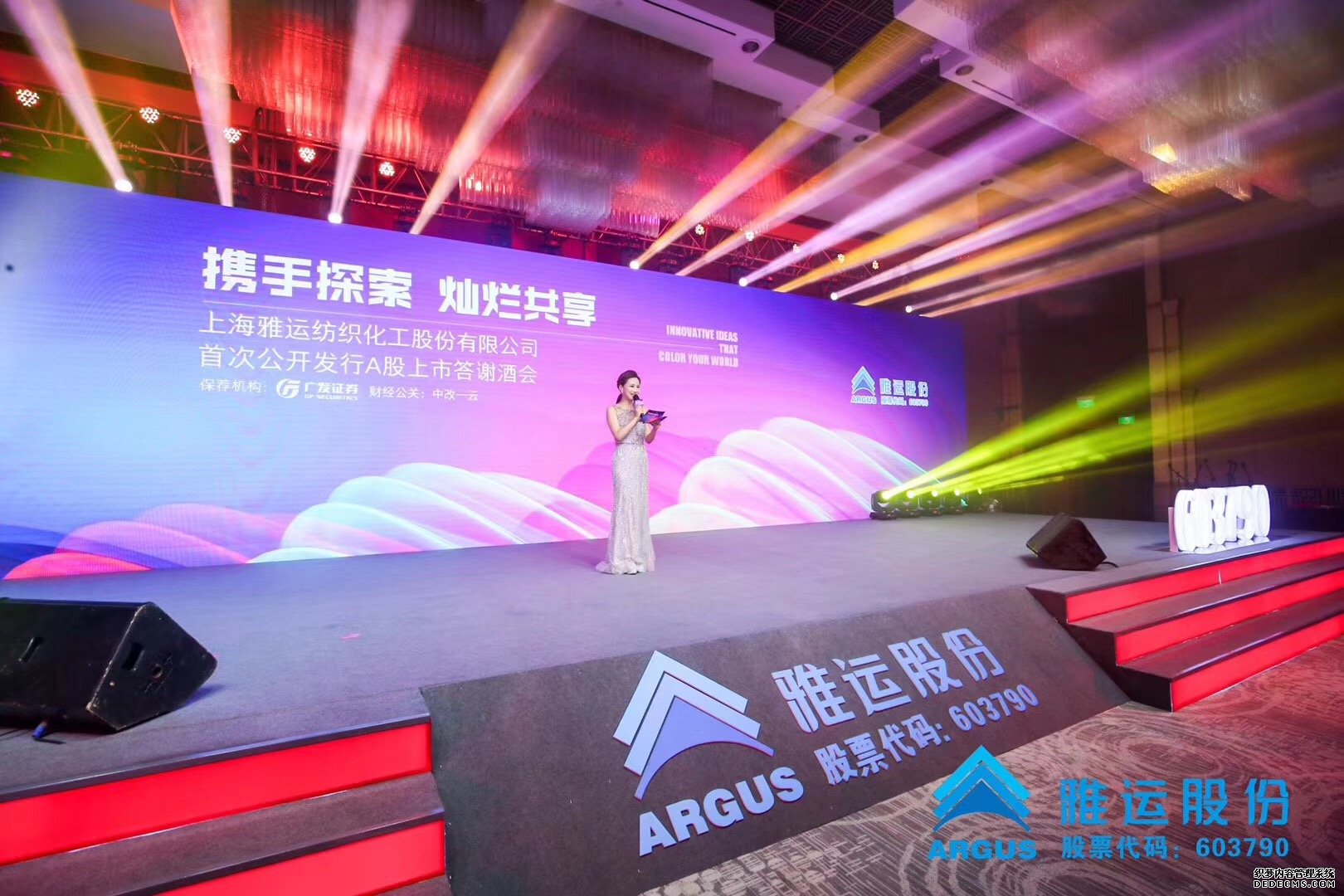 上海雅運(yùn)紡織化工股份有限公司,成立于1999年8月11日,是一家專業(yè)致力于紡織化工產(chǎn)品的研發(fā)、生產(chǎn)加工、市場推廣以及提供技術(shù)服務(wù)的高新科技企業(yè)。 2018年9月11號正式上市登錄A股,‘攜手探索,燦爛共享’就是本次答謝酒會的主題,在這個(gè)歷史性的時(shí)刻,上海束影文化也祝福雅運(yùn)股份紅紅火火。